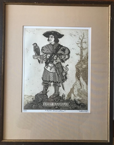 "Kaiser Maximilian", signierte und handschriftlich betitelte, hinter Glas und Passepartout gerahmte Original-Radierung, E. A., 1979. 70x55 cm (Rahmen), 39x31 cm (Motiv). Sehr schön erhalten, nur der Holzrahmen mit Berieb und kleinen Abplatzungen. -Simon Dittrich (* 13. Januar 1940 in Teplitz-Schönau) ist ein deutscher Maler und Graphiker, der seit 1967 weit über 200 Einzelausstellungen hatte. Seit 1976 erschienen verschiedene Mappenwerke über Fabeln, historische Figuren und Personen wie Kant und Kleist sowie verschiedene Städtebilder. - Versand nur ohne Rahmen. Verkauf mit Rahmen nur an Selbstabholer möglich.