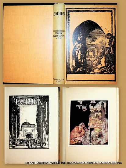 E?then : or traces of travel brougth home from the east / by A. W. Kinglake with an introd. by S. L. Bensusan and designs by Frank Brangwy London, Sampson Low, Marston, 1913. original cloth binding, in 4?, 305 pages, a good copy, 20th century bookplate. First Edition.