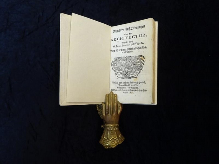 Regul der fünff Ordnungen Von der Architectur, Gestellt durch M. Jacob Barozzio von Vignola, Aufs Neue vermehrt mit etlichen schönen Gebäuen (sic). Augsburg, Johann Friedrich Propst (ca 1753). "16,5 x 10 cm. Kupfertitel, 16 S., 50 Kupfertafeln, neuer Pappband mit den gestochenen Broschürenumschlägen der Originalausgabe, nahezu ungebräuntes und fleckenfreies Exemplar. Die Jahresangabe am Drucktitelbl. lautet auf ""Anno 17"" u. ist handschr. mit 53 ergänzt." "Der gestochene Titel ergänzt den Drucktitel: ""Mit fleis aufgetheilt, übersehen und aus dem grossen in diesen bequemen kleinern format gebracht von Le Muet.""".