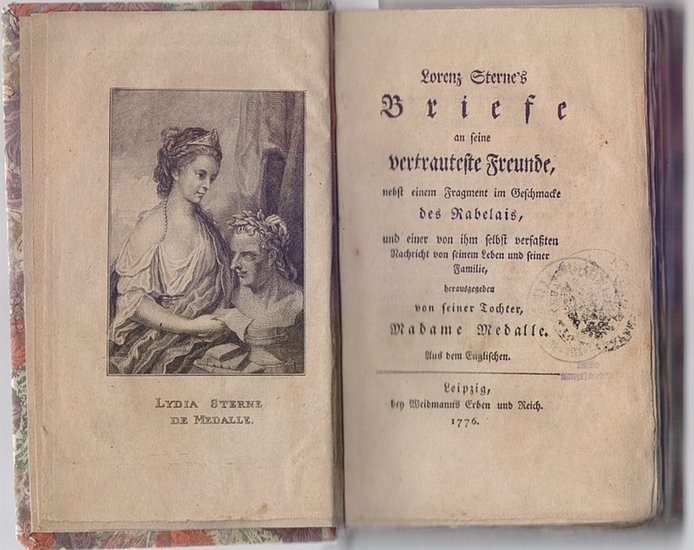 Lorenz Sterne's Briefe an seine vertrauteste Freunde, nebst einem Fragment im Geschmacke des Rabelais, und einer von ihm selbst verfaßten Nachricht von seinem Leben und seiner Familie, herausgegeben von seiner Tochter, Madame Medalle. Aus dem Englischen (von Christian Felix Weiße). - Und: Lor. Sterne's oder Yoricks Briefwechsel mit Elisen und seinen übrigen Freunden. 2 Titel in 1 Band. Leipzig, Weidmann Erben und Reich, 1776, 1775. 8vo. Mit Portrait von Lydia Sterne de Medalle (Kupferstich) auf Frontispiz. XXVIII, 391; XXIV, 184 S. Späterer floral. bunt. Pp. m. orang. RSchild. Unbeschnitten. VD18 10680055 u. VD18 12722820. - Erste deutschen Ausgaben. - Bibliotheksstempel auf Titelblatt (ausgeschieden). Kleine Randnotiz auf S. IV. Leicht befleckt auf S. 261, 269 (I. Band) sowie S. 55-73 (II. Band). Sonst sauberes Ex. - Mit interessantem beigelegtem Zeitungssauschnitt von 1968 (zum 200. Todestag Laurence Sternes).