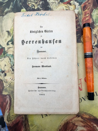 Die Königlichen Gärten zu Herrenhausen bei Hannover : ein Führer durch dieselben. Mit 2 Plänen. Hannover, Hahn, 1852. IV, 90 Seiten, [2] gef. Bl., H 19 x 11,5 cm, OKart. - Vord. Einbandpapier fehlt. Name auf Titel, Papier teilw. gebräunt.