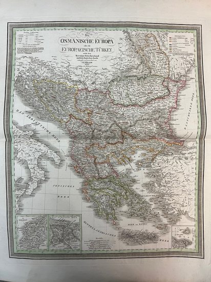 Das Osmanische Europa oder die Europaeische Türkey nebst dem Koenigr. Griechenland und den Ionischen Inseln entworfen und gezeichnet von F. W. Streit. Weimar, Verlag des Geographischen Instituts (1832/33). Altkolorierte Kupferstichkarte. 57,4 x , 78,3 cm (Blattgr.); 51,5 x 74,8 cm (Plattengr.) Mit 1 Faltspur. Teils minimale Randläsuren, sonst gut erhalten. Espenhorst 1.1.2 bzw. S.20-23 - Altkolorierte Karte von Südosteuropa mit 3 kl. Nebenkarte der Dardanellen, des Gebietes um Istanbul und Korfu. Aus dem letzten, 60 Karten umfassenden "Allgemeinen Hand-Atlas der ganzen Erde nebst den besten astronomischen Bestimmungen, neuesten Entdeckungen und kritischen Untersuchungen entworfen" der unter Carl Ferdinand Weiland (1782-1847) im Verlag des geographischen Institutes in Weimar erschienen ist. Die Karten sind teils in der Platte (Kartusche) mit Jahreszahlen 1829 bis 1833 datiert.
