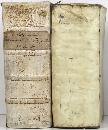 Großmüthiger Feldherr Arminius oder Herrmann, als ein tapfferer Beschirmer der deutschen Freyheit, nebst seiner durchlauchtigen Thusnelda in einer sinnreichen Staats- Liebes- und Helden-Geschichte. 2 Teile in 2 Bänden. Leipzig, Christoph Fleischer für Johann Friedrich Gleditsch 1689-1690. * Mit 2 Kupfertiteln und 18 Kupferstich-Tafeln nach Sandrart. 19 Blatt, 1430 (recte 1432) Seiten; 4 Blatt, 1646, 51 Seiten, 40 Blatt. 25 x 21 cm. Halblederband der Zeit mit Pergamentdeckeln (Band I) und Pergamentband der Zeit (fleckig und berieben); letzterer mit Goldschnitt. *** Goedeke III, 270, 2, 9. Dünnhaupt IV, 2603, 35.1 Hayn-Gotendorf IV, 236. NDB XV, 124 f. - Erste Ausgabe des "heroisch-höfischen Zeitromans, der in enzyklopädischer Gelehrsamkeit am Exempel individueller Konflikte die politische und kulturelle Gesamtsituation der Welt des 17. Jahrhunderts zu schildern sucht" (Dünnhaupt). - Das unvollendet gebliebene Opus magnum des Dichters, Juristen, Diplomaten und Übersetzers Daniel Casper von Lohenstein (1635-1683), einer der Hauptvertreter der Zweiten Schlesischen Dichterschule. - OHNE das Porträt. - Durchgängig unterschiedlich gebräunt und fleckig, ganz vereinzelt kleinere Randschäden. Band I: Vorsatzpapiere erneuert, Titel blass gestempelt; Band II: Vor- und Hintersatz beschädigt, Kupfertitel, eine Tafel und einige Textblätter im unteren Rand mit Ausschnitt (ohne Bild- bzw. Textverlust). - Ein Höhepunkt barocker Romankunst!.