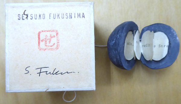 Der Stein. o. O., [Selbstverlag]., o. J. 6,3 x 6,3 x 6,3 cm (Box); ca. 5 x 4 cm (Steinobjekt)., 68482A. Sehr gutes Exemplar. Kleines Fluxusobjekt der in Deutschland lebenden und arbeitenden japanischen Künstlerin Setsuko Fukujima (*1958 Tokyo), bestehend aus einem graublauen Tonobjekt, einen Stein imitierend, mittig glatt aufgeschnitten und einseitig mit zwei grauen Bindfäden zusammen gehalten, in dem eine ovale, leporelloartige Papierkette mit dem Text, jeweils auf einem Blätten gedruckt, "Der Stein, rollt, rollt, rollt, rollt, auf, die Straße" steckt. Auf dem letzten Blättchen von der Künstlerin handschriftlich signiert ("S. Fukujima") und mit einem gezeichneten Siegelchen ("Se") versehen. Der Stein gelagert in einer hellbraunen, handgearbeiteten Klappbox aus handgeschöpftem Japanbütten. Die Box trägt den deutschen Titel "Der Stein" sowie den gestempelten Namen der Künstlein, ihre Signatur und ihr Siegel.