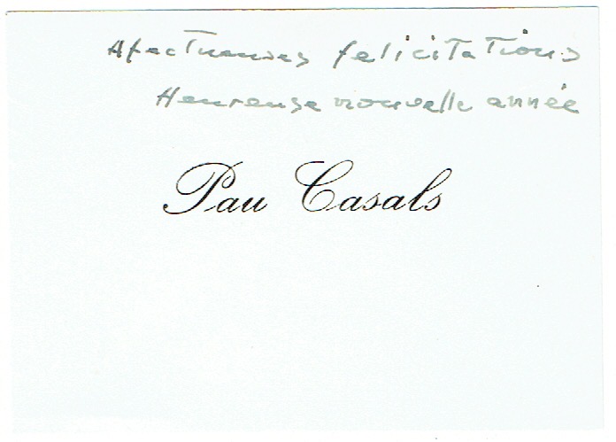 Gedr. Visitenkarte mit eigenh. Zusatz. ohne Ort und Datum. Quer-32mo. 1 p. An die namentlic nicht genannte deutsch-US-amerikanische Musikwissenschaftlerin und Musikagentin Thea Dispeker (1902-2000). ?Afectueuses felicitations Heureuse nouvelle année | PAU CASALS?.