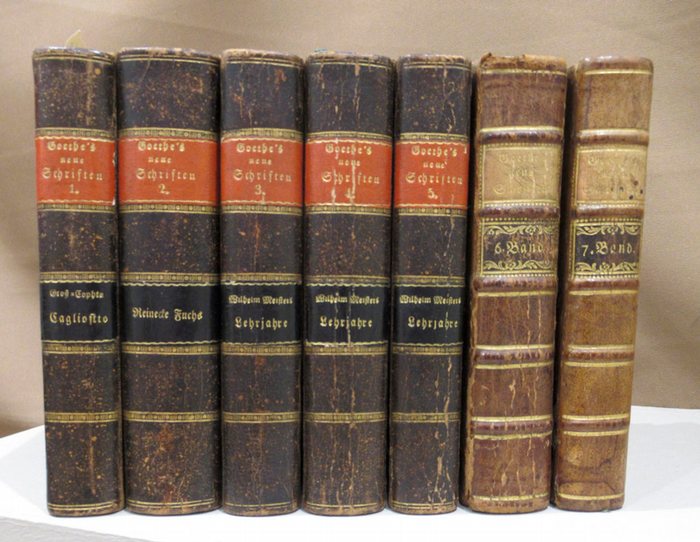 Neue Schriften. 7 Bände. Berlin, Unger 1792 - 1800. 1792. kl.-8°, mit 1 gefalteten Kupfertafel (Stammbaum) in Band 1, 8 gefaltete Notentafeln in den Bänden 3, 4, 5 und 7 sowie 1 Holzschnitt-Vignette und 2 Kupfern in Band 7, Halblederbände der Zeit. Zweite rechtmäßige Gesamtausgabe.- Hagen 14. Goed. IV 3, 4; Slg. Kippenberg I, 336; Slg. Dorn 9;- Mit einigen Erstdrucken Goethes, darunter Wilhelm Meisters Lehrjahre und Reineke Fuchs, sowie einige Gedichte.- Die Musikbeilage in Bd. 6 "So laßt mich scheinen" hier - wie so oft - nicht vorhanden, dafür ist die Beilage "Was hör ich draußen vor dem Thor" in Band 7 eingebunden.- Die Bände 6 und 7 abweichend gebunden. Die Rücken etwas berieben, die Einbanddeckel meist beschabt. Jeder Band mit einem modernen Exlibris.