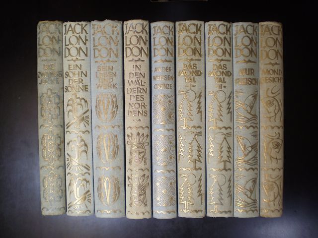 Konvolut von 18 Bänden Berlin, Büchergilde Gutenberg, 1926-1933. Leinen, gebunden; blaue, goldgeprägte Einbände, rote Kopfschnitte / 18 Bände / Anz. Seiten: 254, 271, 274, 299, 257, 259, 297, 299, 265, 294, 336, 260, 285, 261, 274, 308, 243, 310 / 13,8 x 20,2 cm / Zustand: gut, leichte Gebrauchsspuren; Buchblöcke teils etwas schief, Einbände leicht berieben und an den Rücken gebleicht, Schnitte etwas gebräunt und teils fleckig, Kopfschnitte leicht bestaubt, teils Besitzereinträge und Stempel auf Vortitel. Inhalt: Mondgesicht. Seltsame Geschichten / Nur Fleisch. Abenteurer-, Verbrecher- und Streikgeschichten / Das Mondtal. Band 1 und 2. Das grosse amerikanische Volksbuch in zwei Bänden / An der weissen Grenze / In den Wäldern des hohen Nordens. Aus der Goldgräberzeit in Klondike / Jack London. Sein Leben und Werk. Eine Biographie / Ein Sohn der Sonne. Abenteuerfahrten in der Südsee / Die Zwangsjacke / Die eiserne Ferse. Ein sozialer Roman / Der Seewolf. Unter den Robbenfängern der Beringsee / Der Rote. Erotische Erzählungen / Michael, der Bruder Jerrys. Der Roman eines Hundes / Meuterei auf der Elsinore / Menschen der Tiefe. Aus dem Londoner East End / Lockruf des Goldes. Im Lande des Goldrausches / König Alkohol. Ein autobiographischer Roman / Jerry, der Insulaner. Der Roman eines Hundes. Titel auf Anfrage einzeln erhältlich, Preis pro Buch: EUR/CHF 30.00.