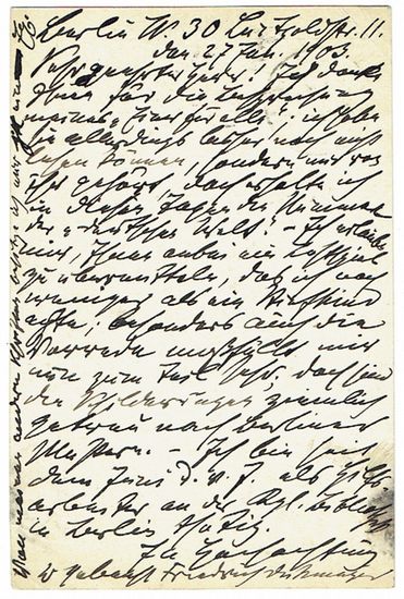 Eigenh. Postkarte mit Unterschrift. Berlin, 27. I. 1903. Quer-kl.-8vo. 1 p. An Karl Burger in Warens am Rhein: ?Ich danke Ihnen für die Besprechung meines ,Einer für alle?; ich habe sie allerdings bisher noch nicht lesen können [?]?Ab 1902 arbeitete er in der Staatsbibliothek in Berlin, 1907 wechselte er an die Bibliothek des Auswärtigen Amts, 1909 an die Berliner Universitätsbibliothek und 1911 schließlich wieder an die Staatsbibliothek. 1908 wurde er in München promoviert.