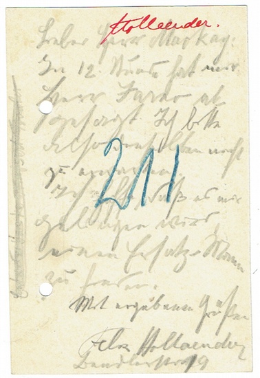 Eigenhändige Postkarte mit Unterschrift. Berlin, 8. V. 1892. Quer-kl.-8vo. 1 p. Bleistift. Gelocht; auf der Textseite Nummerierung mit Kopierstift. An den Schriftsteller John Henry ?[?] Vor 12 Stunden hat mir Herr Farar abgesagt. Ich bitte also denselben nicht zu erwarten. Ich hoffe, daß es mir gelingen wird, einen Ersatz-Mann zu finden. [?]? ? Felix Hollaender war Mitherausgeber und Theaterkritiker der Berliner Wochenzeitung ?Die Welt am Montag? und wurde 1902 Dramaturg, 1904 auch Regisseur bei Max Reinhardt; von 1920 bis 1923 leitete er das Deutsche Theater, danach war er u. a. Theaterkritiker des ?8-Uhr-Abendblatts?. ? Die Gattin des Schriftstellers und Oberspielleiters Rudolf von Lossow (1882?1945) war als Journalistin und Schriftstellerin sowie als Übersetzerin aus dem Schwedischen, Norwegischen, Dänischen und Englischen tätig.