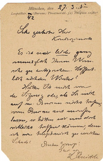 Eigenh. Postkarte mit Unterschrift. München, 27. III. 1905. 8vo. 1p. Die Ecken leicht abgeschnitten. An G. Arnhold in Dresden: ?[?] Es ist mir leider ganz unmöglich Ihrem Wunsche zu entsprechen. Hoffentlich nächsten Winter? Hatten Sie mich von der Sitzung oder, als Sie mich auf m. Bureau nicht trafen vom Bureau aus anrufen lassen, so hätten wir uns doch vielleicht treffen können; denn ich war telephonisch zu erreichen. Schade! [?]?.