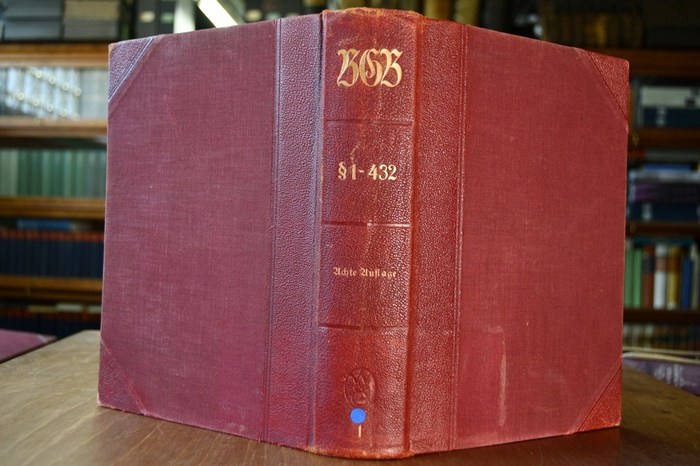 Das Bürgerliche Gesetzbuch mit besonderer Berücksichtigung der Rechtsprechung des Reichsgerichts. I. Band: Allgemeiner Teil, Recht der Schuldverhältnisse I (Allgemeiner Teil). Berlin, Walter de Gruyter, 1935. 8. wesentlich umgearbeitete Auflage VII, 686 S. 25 x 17 cm, Halbleder ohne Schutzumschlag. Einband berieben und bestoßen. Schnitt und innen immer wieder fleckig. Besitzerstempel (Luss Rechtsanwalt Dortmund) auf fliegendem Vorsatz und Titel. Eselsohrig.