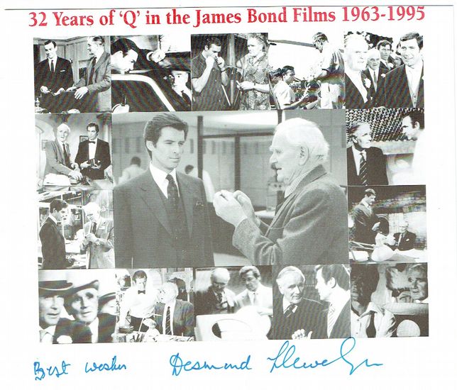 Collage mit eigenh. Widmung und Unterschrift. ohne Ort und Datum. 180 : 160 mm. Collage zeigt Bilder der James Bond Filme von 1963-1995, in denen Desmond Llewelyn als ?Q? zu sehen war.