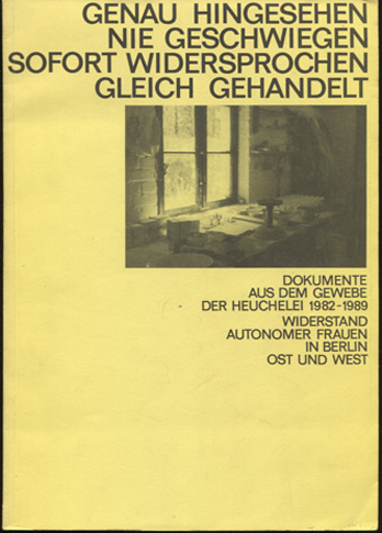Genau hinsehen, nie geschwiegen, sofort widersprochen, gleich gehandelt. Dokumente aus dem Gewebe der Heuchelei 1982-1989, Widerstadt autonomer Frauen in Berlin Ost und West. Hrsg.: Bildungswerk für Demokratie und Umweltschutz. Berlin, Bildungswerk für Demokratie und Umweltschutz, 1990. Unpaginiert, illustriert, 30 x 21 cm, Broschur. Einband leicht berieben mit geringfügigen Randläsuren und Knickspuren. Innen sehr gut. Gutes Exemplar.