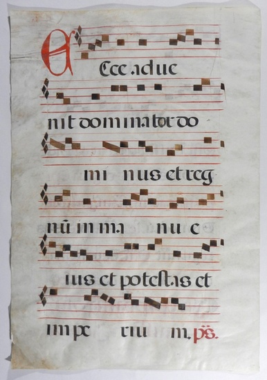 Großes Eiinzelblatt LXXV aus einem Missale wohl aus dem 15. Jahrhundert auf Pergament. Saubere Handschrift in rot und schwarz mit Noten. 48 x 33 cm _. (Geringe Randläsuren, sonst wohlerhalten, vgl. Abbildungen).