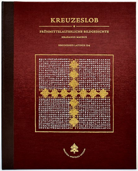 Kreuzeslob. Frühmittelalterliche Bildgedichte. Reginensis Latinus 124. 2 Bände in Kassette [Faksimileband und Kommentarband, komplett]. Vatikanstadt und Stuttgart, Verlag Biblioteca Apostolica Vaticana und Belser Verlag, 2019. 2°. 41 x 32,5 [Kassette] / 37,5 x 29,5 cm [Bände]. 62, 1 Blatt [Faksimileband]; 112 Seiten [Kommentarband]. Original-Klappkassette in Halbleder mit Faksimileband in Original-Ganzleder auf 7 Bünden sowie Kommentarband in Original-Broschur, jeweils mit goldgeprägten Titeln bzw. gold- und blindgeprägtem Buchschmuck. Faksimileausgabe in Latein mit deutschsprachigem Kommentarband. Nummer 462 von 999 nummerierten Exemplaren. Mit 4 ganzseitigen Miniaturen und 28 Bildgedichten im Faksimileband sowie weiteren 125 Farbillustrationen und Literaturverzeichnis im Kommentarband. Beiliegend das zugehörige Zertifikat (nicht personalisiert). Farbfaksimile des illuminierten Codex Vaticanus Reginensis Latinus 124 des "Praeceptor Germaniae" der karolinischen Renaissance, Hrabanus Maurus. "Das Kreuzeslob De laudibus sanctae Crucis des Fuldaer Gelehrten, Abtes und späteren Mainzer Erzbischof Hrabanus Maurus ist der Höhepunkt mittelalterlicher Figurengedichte. In 28 Gedichten, die in meist 37 Zeilen zu quadratischen Textkörpern bildhaft gefasst sind, werden in der Regel in Hexametern verschiedene Aspekte des Kreuzes Christi behandelt, auf die durch ornamentale, vegetabile oder figürliche Bildgestaltungen, die ohne eine Wiederholung variantenreich Kreuzformationen nachbilden und in denen sich Intexte befinden, Bezug genommen wird. [...] Die im Buchschmuck reichste Ausfertigung des Kreuzeslobs ist die in der Biblioteca Apostolica Vaticana aufbewahrte Handschrift Reg. lat. 124. Sie gilt heute als das Exemplar, das Hraban für den Mainzer Erzbischof Haistulf (amt. 813-825) ausfertigen und dann später ergänzen ließ. In ihr zeigt sich das Fuldaer Skriptorium des 9. Jahrhunderts als leistungsfähige Buchmalerei-Werkstatt, in der Aspekte der Schulen von Tours, wo Hraban selbst als Schüler Alkuins einen Teil seiner Ausbildung erhalten hat, und Lothringiens erkennbar werden." (aus dem Vorwort Beuckers). Kassette wenig fleckig und minimal berieben, Bücher neuwertige Exemplare.