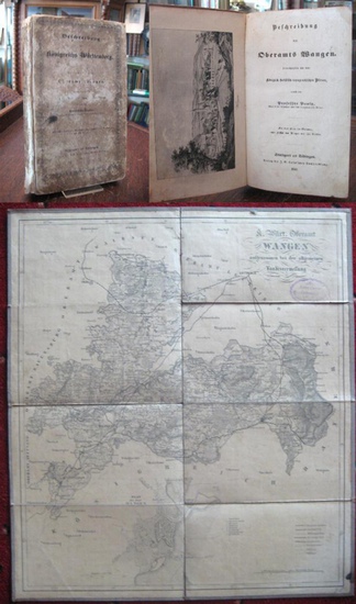 Beschreibung des Oberamts Wangen. Herausgegeben von dem Königlich statistisch-topographischen Büreau. Stuttgart-Tübingen, Verlag der Cotta'schen Buchhandlung, 1841. 8° (21x13), 284 S., mit einer Karte des Oberamts, einer Ansicht von Wangen und vier Tabellen (so komplett), OPbd,. berieben, Kanten stark bestossen, Kapitale mit kleinen Fehlstellen, die Karte auf Leinwand aufgezogen beiliegend und mit Stempel, Papier mit gelegentlichen Eckknicken, ordentliches festes Exemplar, [Heyd II 6493].- im seltenen Verlagseinband.-.