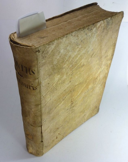 Thesaurus Casuum ConscientiaeContinens Praxim exactissimam de Censuris Ecclesiasticis Aliisque Poenis, etCanonicis impedimentis, in Septem Libros distributus, In quorum ... ; Nec nonDecisiones Casuum Conscientiae per eundem Sayrvm ex Doctrina Consiliorum MartiniAzpilcuetae Doctorus Nauarri depromptae, ac peraccommode dispositae... Venetiis : apud B. Baretium, 1618-1619. [6] Bl., 563 S., [28] Bl., 4 Bl., 158 S., [17] Bl.Quart 33,5 x 24 cm, Pergament, mit handschriftlichem Rückentitel, Titelblatt mit Druckermarke, Rot und Schwarzdruck, mit Vignetten. Text in Latein. Zwei Bände in 1 Band. Ausgeschiedenes Bibliotheksexemplar, am Einband etwas fleckig und berieben, am Buchrücken rissig, mit kleinem Namenseintrag auf dem vorderen, fliegenden Vorsatz, nur vereinzelt minimaler Wurmfraß, nur vereinzelt leicht fleckig, wenige Seiten leicht wasserfleckig. Einige Seiten nachgedunkelt, insg. noch gut erhalten.