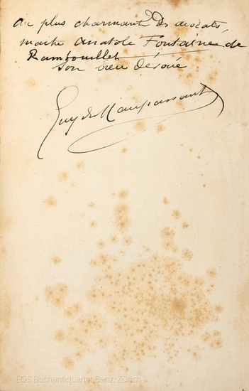 Des vers. Paris, G. Charpentier, 1880. 8°. (3) Bl., 209 S., (2) Bl. Neuer Pappband (Orig.-Umschlag miteingebunden). + Wichtig: Für unsere Kunden in der EU erfolgt der Versand alle 14 Tage verzollt ab Deutschland / Postbank-Konto in Deutschland vorhanden +, 7861CB|7861CB_2|7861CB_3. Erste Ausgabe. Mit handschr. Widmung vom Autor an Anatole Fontaine de Rambouillet. ? Das Papier durchgehend stärker stockfleckig. Die Ränder unbeschnitten.