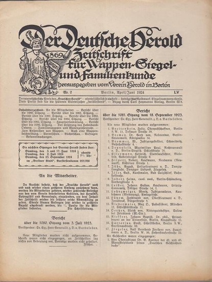 Der Deutsche Herold. Nr. 2, April / Juni 1924. LV. Jahrgang. Zeitschrift für Wappen-, Siegel- und Familienkunde. Aus dem Inhalt: Stephan Kekule von Stradonitz - Der Ursprung des Hosenband - Ordens / Walter Freier: Familienwappen und Warenzeichenrecht / Kurd v. Stratz: Zum Ansprechen von Wappen.