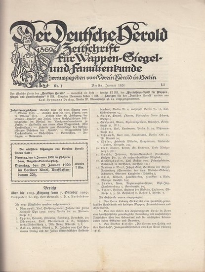 Der Deutsche Herold. Nr. 1, April 1920. 51. Jahrgang. Zeitschrift für Wappen-, Siegel- und Familienkunde. Aus dem Inhalt: Bericht über die Festsitzung des Vereins 'Herold' aus Anlaß seines fünfzigjährigen Stiftungsfestes im Hörsaal des Kunstgewerbenmuseums zu Berlin / Facsimilia aus einem alten Wappenbuch (ohne die Kunstbeilage) / Stephan Kekule von Stradonitz: Festrede zum Gedenktage des fünfzigjährigen Bestehens des 'Herold' / Adolf Closs: Wappenkunst und Trachtenkunde.